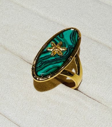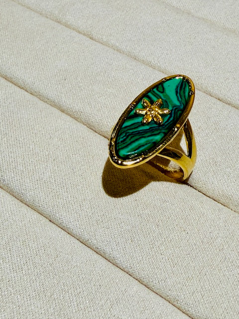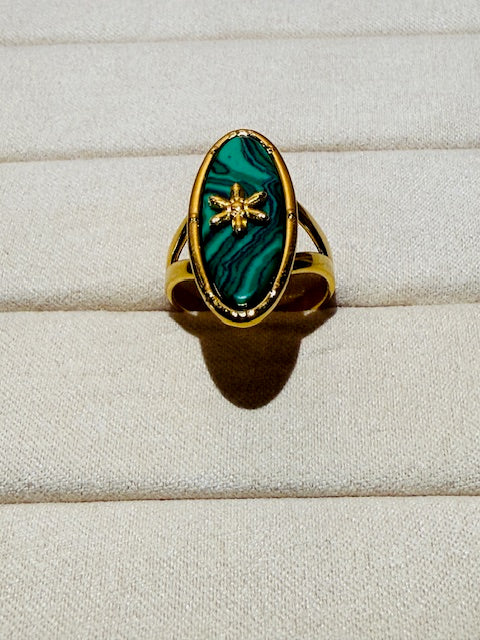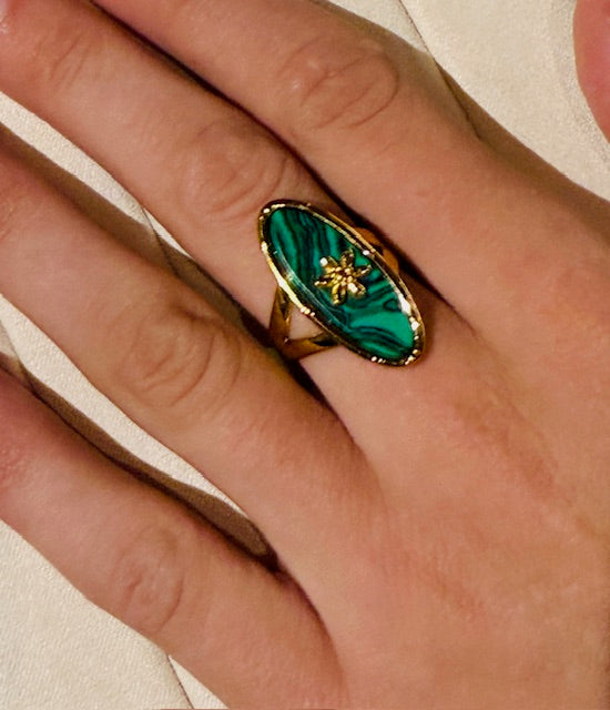 This large oval shape emirald stone with star statement ring is crafted from hypoallergenic stainless steel, ensuring comfort even for sensitive skin. Studded with glass stone. Its bold design features an intricate flower motif, making it a standout accessory for any outfit. Durable and resistant to tarnish, this ring combines elegance with long-lasting wearability. Perfect for those who appreciate unique jewelry without compromising on skin safety.