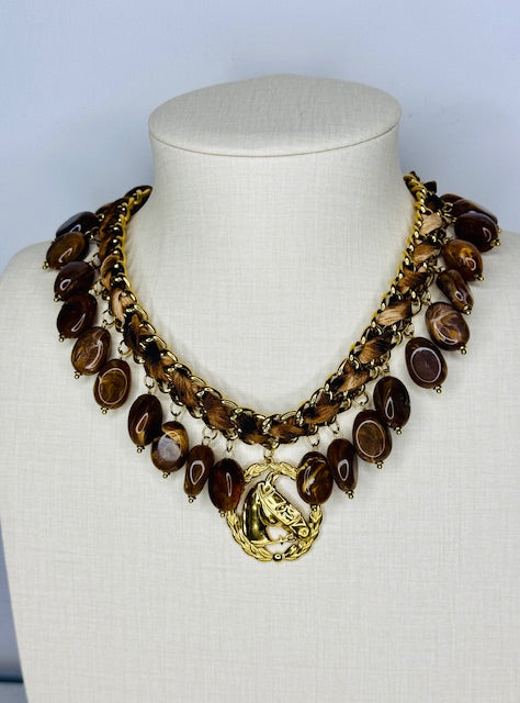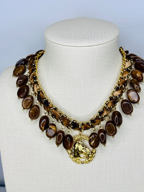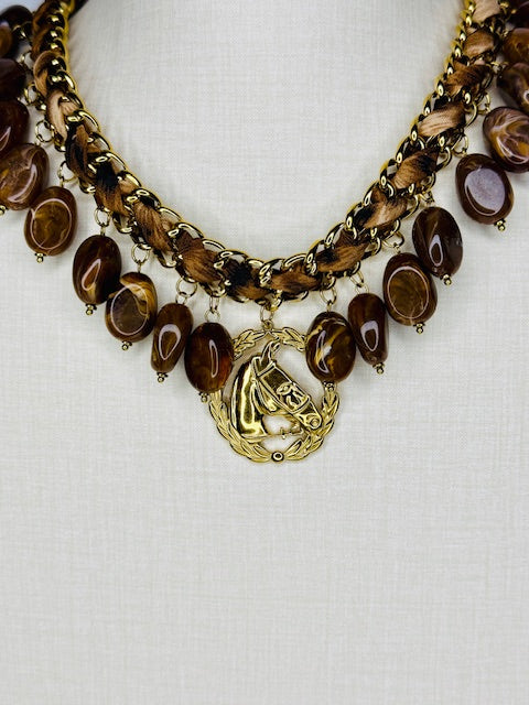 Horse Head Godolphin charm hypoallegenic stainless steel tiger eye stone grande statement animated necklace